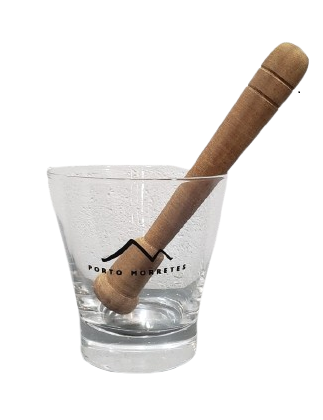 Copo de vidro com o logo da Porto Morretes para a degustação de caipirinha e outros drinks. Acompanha o macerador/socador de frutas.